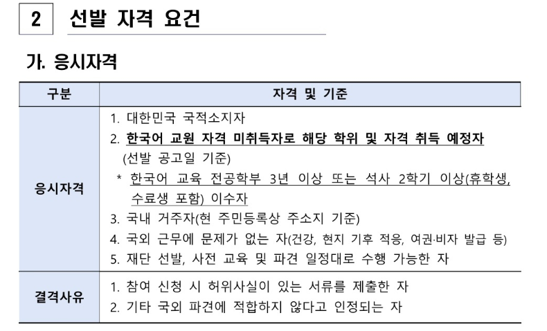 아래와 같이 선발 자격 요건과 파견지 및 지원사항 등 확인할 수 있습니다. 더 자세한 내용을 확인하고 싶으시면 세종학당재단 사이트로 방문하셔서 확인 가능합니다.