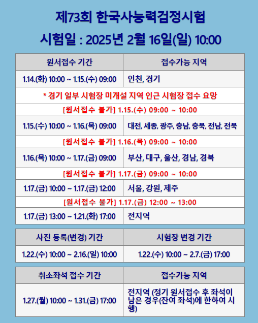 제73회 한국사능력검정시험 지역별 시험 접수 안내