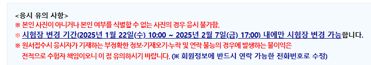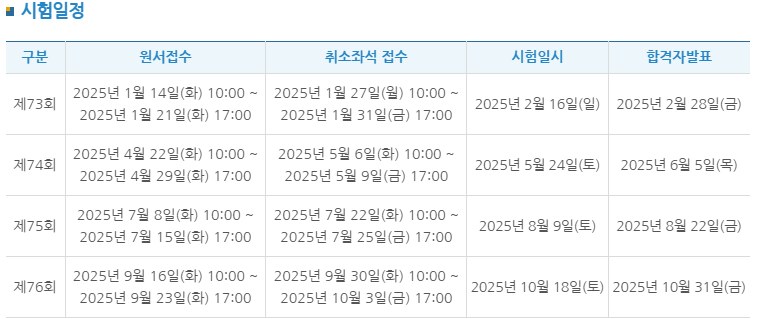 2025년 1월 14일부터 1월 21일까지 올해 첫 시험 원서접수 기간인데, 시험장 지역 별로 원서접수 기간이 상이하므로 아래 일정 참고 하시어 접수하시길 바랍니다.